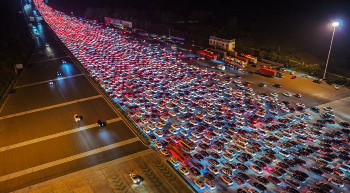 Videot e publikuara tregojnë kabinën e pagesës me 36 korsi në Wuzhou që shkëlqen nga dritat e kuqe të makinave të panumërta që presin të kalojnë. Sipas autoriteteve, më shumë se 120,000 automjete kaluan nëpër stacion vetëm ditën e fundit të festës.