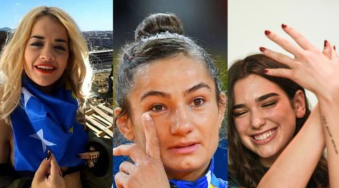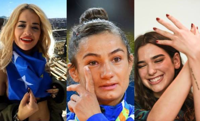 Në këtë fotografi të dizajnuar nga “Image of Kosova”, shihen këngëtaret shqiptare me fame botërore Rita Ora, Dua Lipa dhe kampionia e botës, Majlinda Kelmendi, ndërsa shkruhet “Bac, çikat na e zbardhen ftyrën!”.