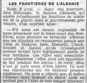 Gazeta franceze “Le Radical” ka botuar të mërkurën e 9 prillit 1913, në faqen 3, intervistën e patriotit dhe trimit shqiptar, Isa Boletini, në lidhje me përcaktimin e kufijve të Shqipërisë.