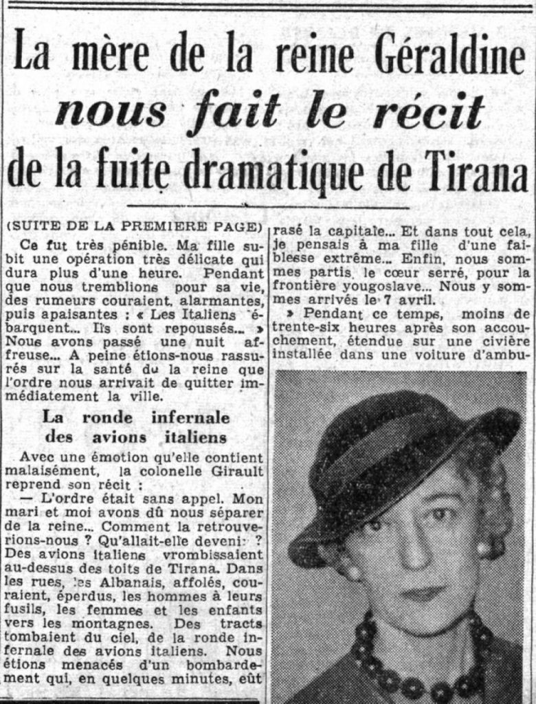 Gazeta franceze, « Paris-soir », ka botuar, të hënën e 17 prillit 1939, në faqet n°1 dhe 3, rrëfimin e nënës së mbretëreshës Geraldinë, e cila gjendej në Tiranë në momentin kur Italia fashiste nisi të pushtonte Shqipërinë.