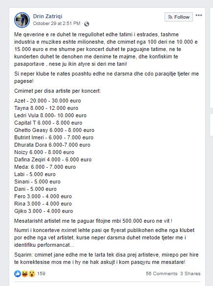 Sqarim: cmimet jane edhe me te larta tek disa prej artisteve, mirepo per hire te korrektesise mos me i hy ne hak askujt i kom pasqyru me mesatare!”, ka shkruar Drin Zatriqi në Facebook.