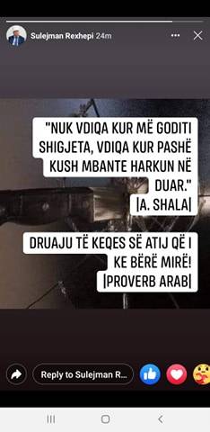 Ish kreu i BFI-së së Maqedonisë së Veriut, Sulejman Rexhepi sot ka publikuar një fotografi në Facebook, ku ka shkruar “Nuk vdiqa kur më goditi shigjeta, vdiqa kur pashë se kush mbante harkun në duar” e shoqëruar nga thënia “Druaju të keqes së atij që i ke bërë mirë”.
