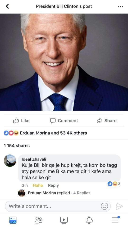 Ish-presidenti Clinton poston foto, komenti i shqiptarit ju shkrin së qeshuri (FOTO)