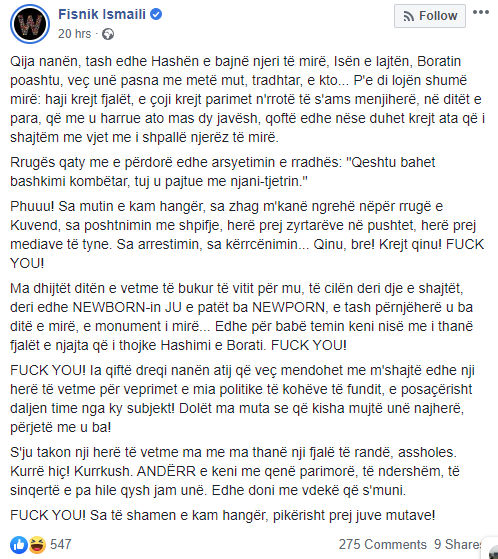 “Kurrë hiç! Kurrkush. ANDËRR e keni me qenë parimorë, të ndershëm, të sinqertë e pa hile qysh jam unë. Edhe doni me vdekë që s’muni”, thuhet në shkrimin e Ismailit.