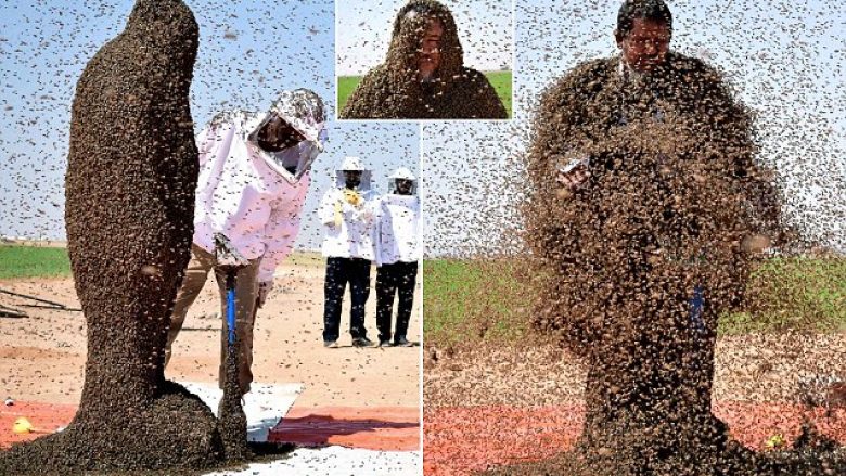 Një burrë nga Arabia Saudite ka mbuluar fytyrën dhe gjithë trupin me bletë, në tentim që të thyej rekordin botëror me numrin më të madh të bletëve në trup.