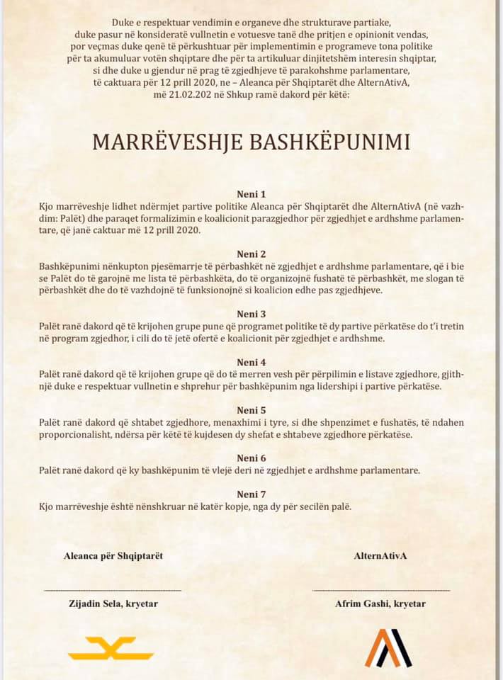 Duke e respektuar vendimin e organeve dhe strukturave partiake, duke pasur në konsideratë vullnetin e votuesve tanë dhe pritjen e opinionit vendas, por veçmas duke qenë të përkushtuar për implementimin e programeve tona politike për ta akumuluar votën shqiptare dhe për ta artikuluar dinjitetshëm interesin shqiptar, si dhe duke u gjendur në prag të zgjedhjeve të parakohshme parlamentare, të caktuara për 12 prill 2020, ne – Aleanca për Shqiptarët dhe AlternAtivA, më 21.02.202 në Shkup ramë dakord për këtë: