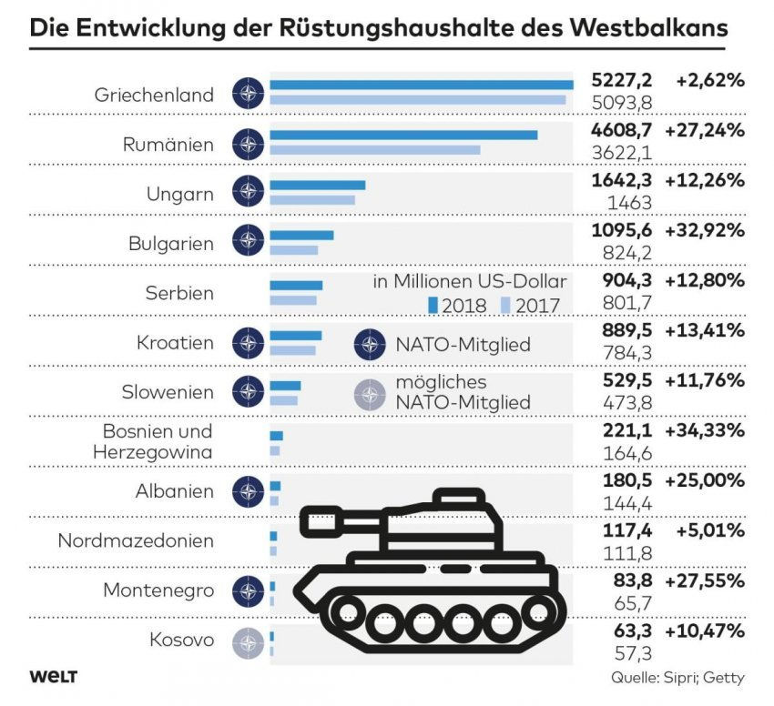 Të parët janë grekët me mbi 5.2 miliardë euro në vitin 2018 si buxhet për armatimin. Më pas vijnë rumunët me 4.6 miliardë euro. Serbët shpenzojnë 904 milionë euro, diçka më shumë se kroatët që harxhojnë 889 milionë euro. Shqipëria shpenzon 180 milionë euro, një rritje me 25 përqind me vitin 2017. Kosova shpenzon vetëm 63.3 milionë euro.
