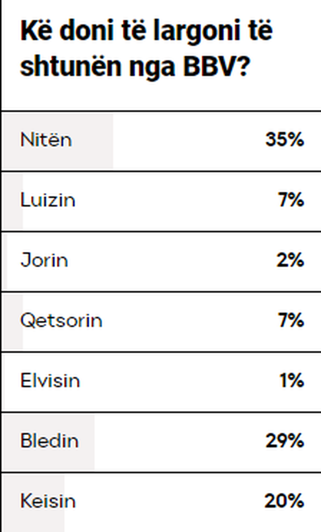 Xing publikoi një sondazh ku patët mundësinë të votonit për banorin që dëshironi të largohet dhe votat më të shumta kanë qenë për Nitën, e cila ka marrë 35%.