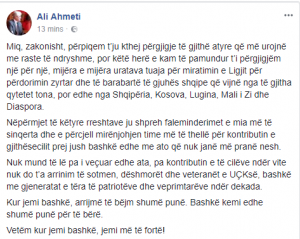 Kryetari i Bashkimit Demokratik për Integrim Ali Ahmeti, ka shrytëzuar faqen e tij zyrtare në Facebook për tu falimenderuar të gjithë shqiptarëve të cilët i dërgojnë porosi e që kanë të bëjnë me zyrtizimin e gjuhës shqipe në Maqedoni, njofton Aktuale.mk