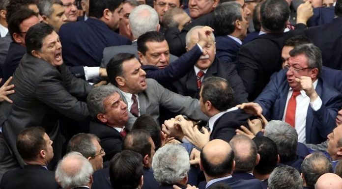 Deputetë të shumicës dhe opozitës në parlamentin turk u përfshinë në një konfrontim fizik në ambientet e parlamentit. Përleshja ndodhi fill pas miratimit të disa neneve të reja të ligjit elektoral.