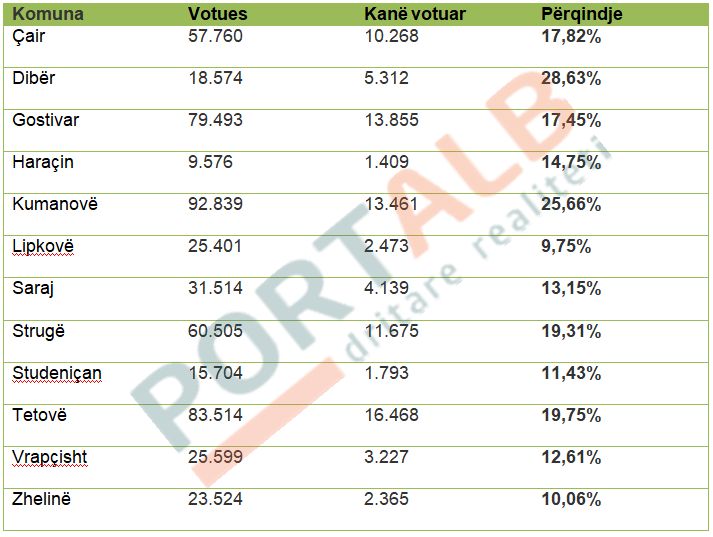 Sipas komunave me shumicë shqiptare, më shumë votues kanë votuar në Komunën e Kumanovës me 25.66%, ndërsa më pak në Komunën e Lipkovës me 9.75%./Portalb