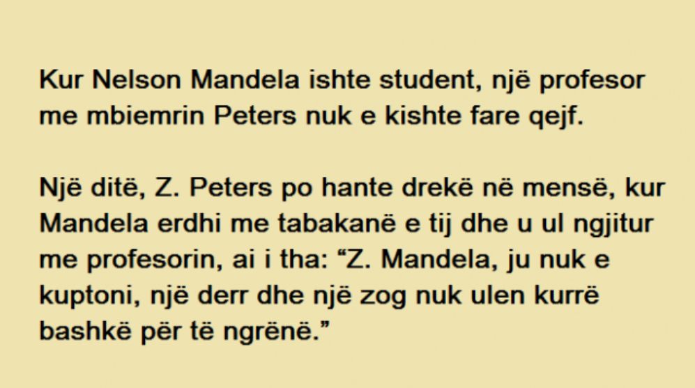 Një ditë, Z. Peters po hante drekë në mensë, kur Mandela erdhi me tabakanë e tij dhe u ul ngjitur me profesorin, ai i tha: “Z. Mandela, ju nuk e kuptoni, një derr dhe një zog nuk ulen kurrë bashkë për të ngrënë.”