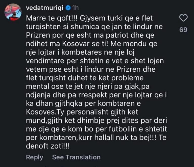 Gjithçka nisi pasi një përdorues e etiketoi yllin dardan si “gjysmë-turku”, duke vënë në dyshim përkatësinë dhe përkushtimin e tij ndaj Kosovës. Por reagimi i Muriqit ishte i menjëhershëm dhe mjaft i ashpër, njofotn Gazeta Minuti.