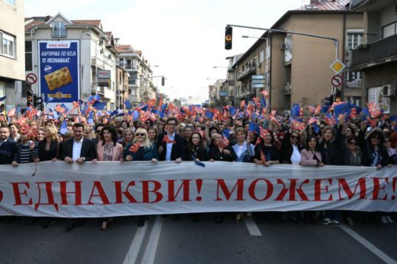 Në marsh merr pjesë edhe kryetari i LSDM-së dhe kryeministri Zoran Zaev, kandidati për president të Republikës së Maqedonisë së Veriut, Stevo Pendarovski, koordinuesja e Forumit të Grave të LSDM-së, Cvetanka Laskova dhe Maja Javornik nga Partia e socialistëve evropianë.