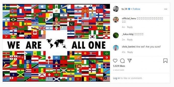 Ylli i Basel përmes një postimi në Instagram ka shkruajtuar: “Jemi një të gjithë”, duke i bashkangjitur një foto ku janë flamujt e të gjithë shteteve të botës.