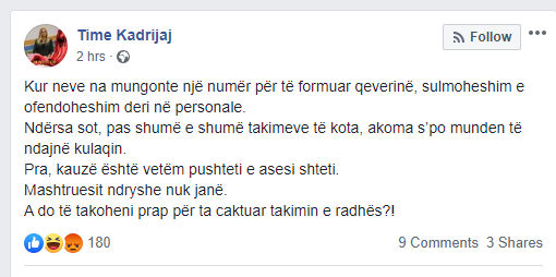Kadrijaj ka shkruar në profilin e saj në Facebook, se kur AAK-së i mungonte një numër për të formuar Qeverinë, ata sulmoheshin e ofendoheshin deri në personale, transmeton Telegrafi.