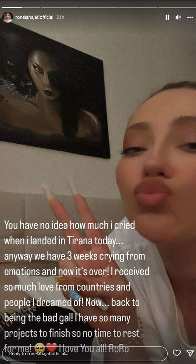 “Nuk e keni idenë sa kam qarë kur mbërrita në Tiranë sot… gjithsesi kam tre javë që qaj nga emocionet dhe tani gjithçka ka mbaruar. Kam marrë shumë dashuri nga shumë shtete dhe njerëz. Tani… po rikthehem te ajo që isha! Kam shumë projekte për të përfunduar dhe nuk kam kohë për pushim. Ju dua shumë”, ka shkruar Hajati.