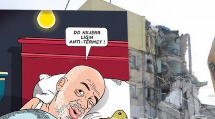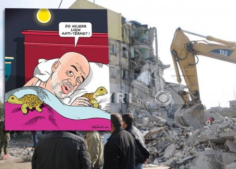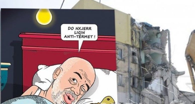 Ndërkohë mjeshtri Bujar Kapexhiu ka vendosur ta thumbojë kryeministrin Edi Rama, me një karikaturë ku duket Edi Rama në krevat, teksa thekson se do të shpallë një ligj anti-tërmet.