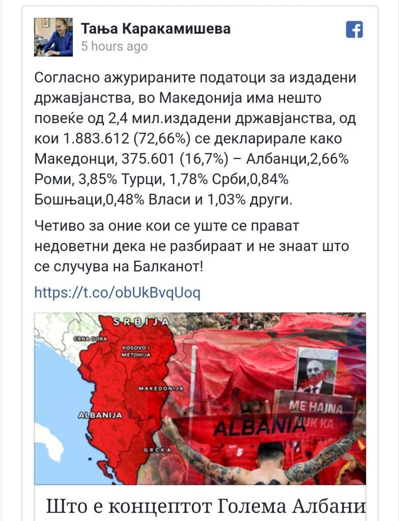 Sipas Karakamishevës, e cila njihet si e afërt me opozitën aktuale, maqedonasit përbëjnë 72.66%, shqiptarët 16.7%, ronët 3.85%, turqit 2.66%… Sipas saj, Maqedonia Veriore për momentin ka gjithsej 2.4 milionë banorë./FAKTE