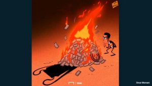 “Nuk ishte një natë e këndshëm për pronarin e PSG-së, Nasser Al-Khelaifi, i cili ishte dëshmitar i eliminimit të klubit të vet nga Liga e Kampionëve nga Real Madridi, edhe pse ka shpenzuar shuma të mëdha parash për ta përmirësuar skuadrën”, e përshkruan Goal.com karikaturën e ditës me PSG-në dhe pronarin e saj. /albeu.com/