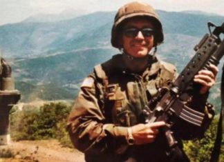 Shqiptari nga LLojani i Kumanoves me uniformë ushatarake amerikane priti sekretaren e SHBA-së Medlin Ollbrajt ne një pikë rrezistence gjatë luftës së Kosovës.