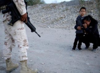 Lety Perez, ra në gjunjë, me njërën dorë e mbuloi fytyrën ndërsa në tjetrin krah e mbante djalin e saj 6 vjeçar, teksa i luteshin ushtarit të Gardës Kombëtare të Meksikës që t’i lejojë...