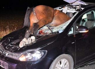 Fotot e një aksidenti spektakolar në Gjermani po bëjnë xhiron e rrjetit. Një kalë u përplas me xhamin e përparmë të një makine. Shoferja 57-vjeçare e një makine Volkswagen nuk e kishte parë kalin...