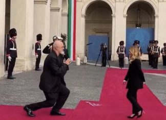 Rama pritet me ceremoni zyrtare nga Giorgia Meloni, i ulet sërish në gjunjë kryeministres...