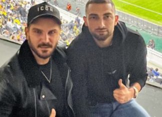 Eros Grezda shfaqet krah aktorit Tolgahan Sayisman në një ndeshje futbolli në Turqi