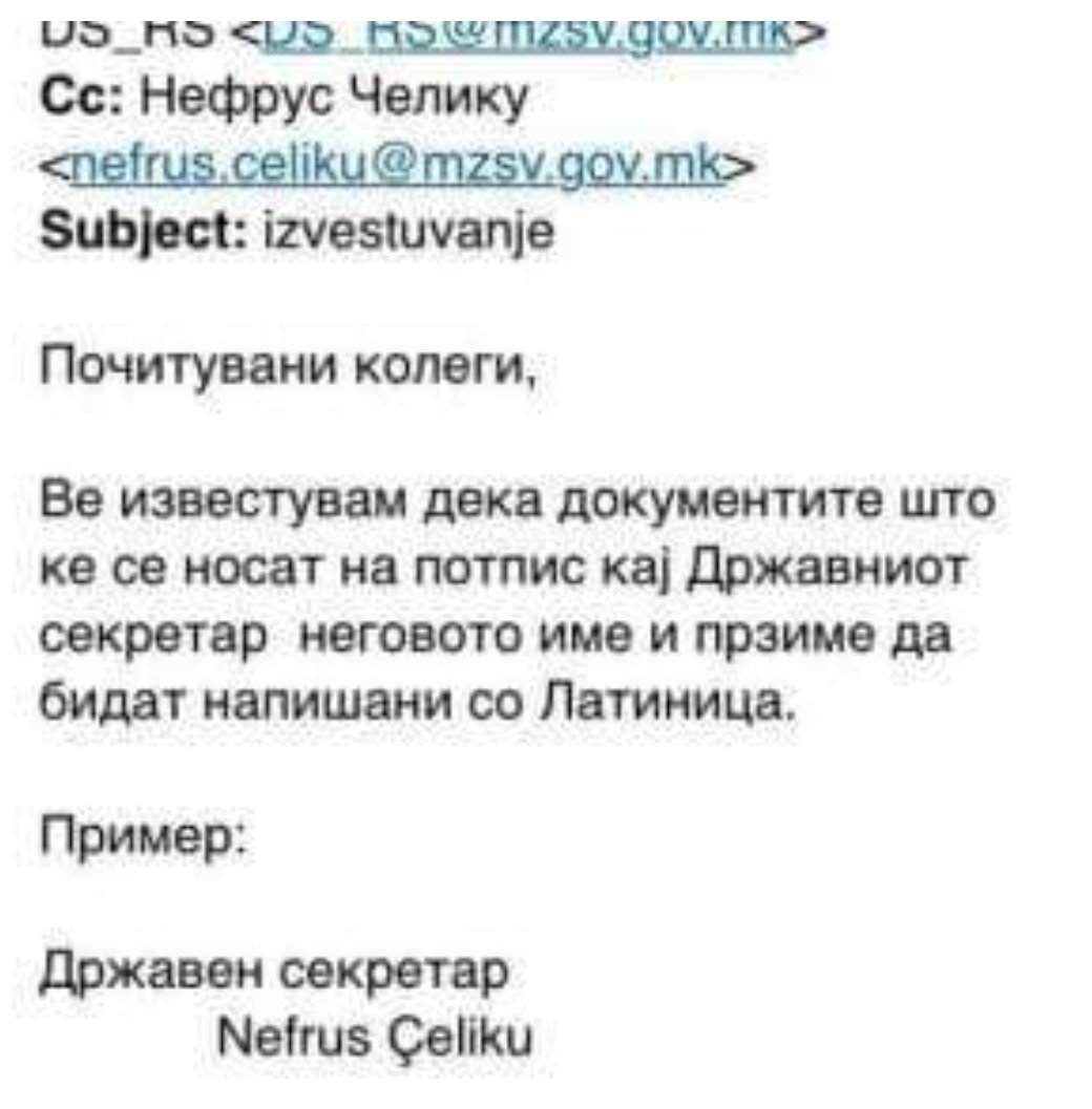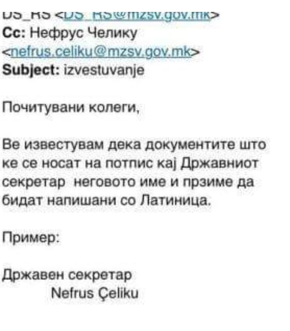 Shkak për këtë reagim sipas portalit “Lider” ka qënë urdhëri i tij ndaj të punësuarve që emri i tij në dokumente të figurojë origjinal në alfabetin shqip dhe jo cirilik. Ky veprim i tij ka bërë që të punësuarit ta nxjerrin këtë në media, duke shprehur reagime. Kësaj historie i bashkëngjitet edhe një email zyrtar, që Nefrus Çeliku i ka dërguar të punësuarve ku ka kërkuar të shkruhet si duhet emri i tij. (ina)