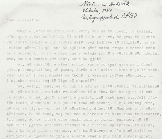 Unë, besoj, nanë, se ti nuk je ajo që thotë kështu. Ti gjithmonë u ke përballue burrnisht rrebesheve të mëdha. Unë besoj se ti nuk je lodhë. Rruga jonë, mendja e shpirti ynë kanë pasur strofull fjalën tande, dashuninë e kujdesin tand të pashoq. Kur i kujtoj këto, më del se ti, në vend se të mërzitesh, duhet të gëzohesh e të përtërihesh. Ma në fund, veç tuj mos u dorëzue në këtë kohë të vështirë, ti nanë, do ta qitësh edhe hapin tand të fundit burrnor, që të bon si të gjitha ato nana trimnesha e fisnike shqiptare, të cilat, kur e ka lypë puna e vatanit, s’e kanë kursye e s’e kanë kajtë me lot jetën e djemve të tyne dhe kanë këndue kur kanë kukatë qyqet.