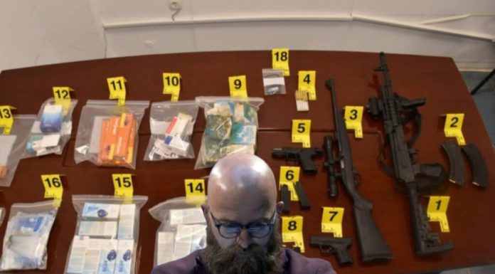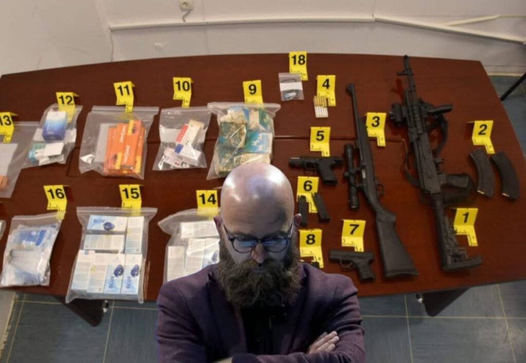 Gjatë kontrollit të kryer në pronat e të dyshuarit, me asistencën e inspektorëve nga Ministria e Shëndetësisë, u gjetën dhe u sekuestruan dy armë zjarri të gjata dhe dy armë zjarri të shkurtra, si dhe sasi të ndryshme municioni dhe karikatorë të armëve.