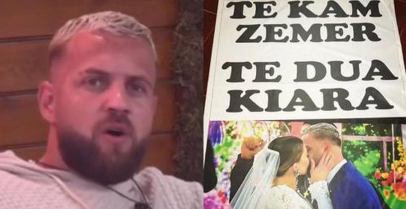 Droni mbante banderolën ku shkruhej “Të kam zemër, të dua, Kiara”, teksa mbante dhe foton e dyshes nga puthja e dasmës brenda BBV-së.
