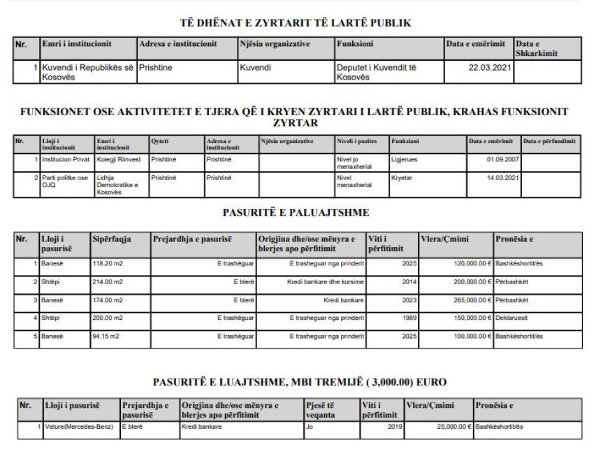 Sa i përket pasurisë së luajtshme, ai ka deklaruar një veturë Mercedes-Benz të vitit 2019, me vlerë rreth 25 mijë euro, në pronësi të bashkëshortes.