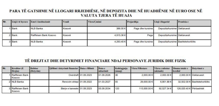 Sa u përket detyrimeve, ai ka deklaruar kredi për renovim shtëpie me mbetje prej 32,502 euro dhe kredi për blerje banese me detyrim të mbetur 126,020.40 euro.