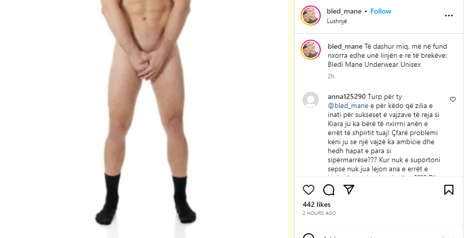 “Të dashur miq, më në fund nxorra edhe unë linjën e re të brekëve: Bledi Mane Underwear Unisex”.