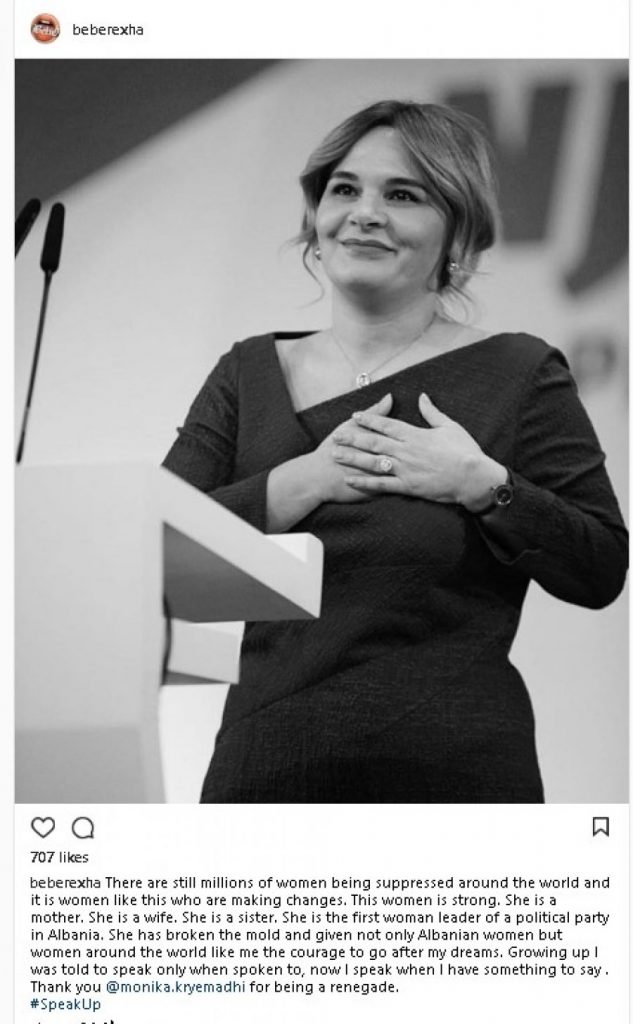 “Ka ende miliona gra të shtypura në mbarë botën dhe janë gra të tilla që po bëjnë ndryshime. Kjo grua është e fortë. Ajo është një nënë. Ajo është grua. Ajo është një motër. Ajo është liderja e parë femër e një partie politike në Shqipëri.