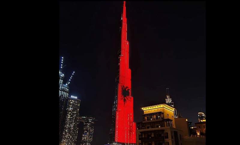 Kulla më e lartë në botë, “Burj Khalifa” që gjendet në Dubai, u “vesh” pasditen e së hënës me ngjyrat e flamurit Kuq e Zi.