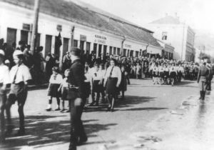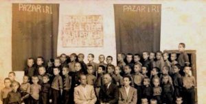 Pazari i ri, 1943: Kur Sanxhaku frymonte shqip, dhe valonte Flamuri Shqiptar. Në foto nxënësit dhe mesuesit e shkollës fillore “Naim Frashëri” në Pazarin e Ri. Sot shqiptarët në Pazarin e Ri janë asimiluar në boshnjak dhe pothuajse të gjithë flasin serbisht.