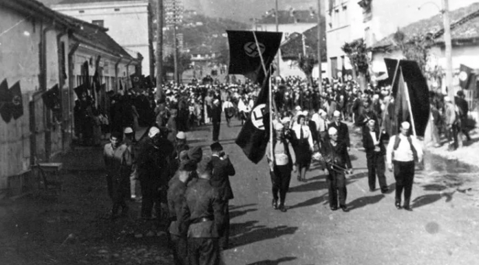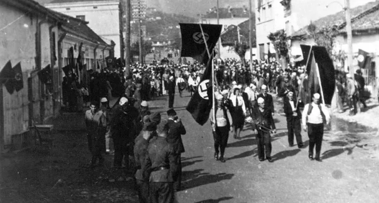 Në foto shihen ushtarër shqiptarë së basku me ushtarët italianë dhe gjermanë duke mbajtur flamurin shqiptar dhe nazist në Pazarin e Ri, në vitin 1941.