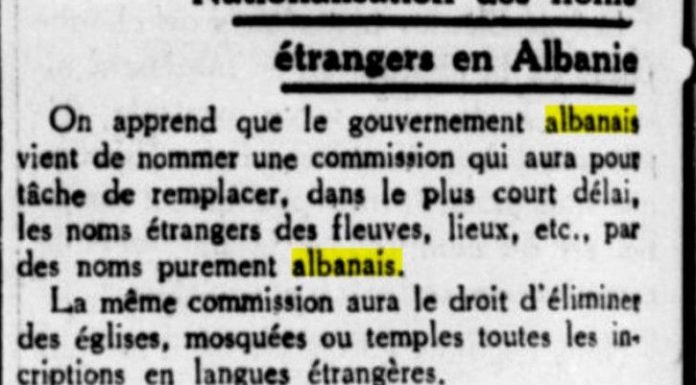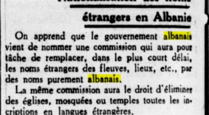 “Mësojmë se qeveria shqiptare sapo ka caktuar një komision i cili do të ketë për detyrë të zëvendësojë, në një kohë shumë të shkurtër, emrat e huaj të lumenjve, vendeve, etj., me emra krejtësisht shqiptarë. I njëjti komision do të ketë të drejtën të heqë nga kishat, xhamitë ose tempujt të gjitha mbishkrimet në gjuhë të huaja”, thuhet në shkrim.