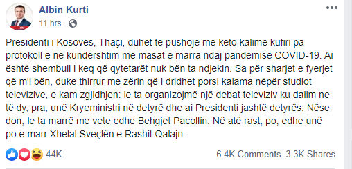 “Ai është shembull i keq që qytetarët nuk bën ta ndjekin. Sa për sharjet e fyerjet që m’i bën, duke thirrur me zërin që i dridhet porsi kalama nëpër studiot televizive, e kam zgjidhjen: le ta organizojmë një debat televiziv ku dalim ne të dy, pra, unë Kryeministri në detyrë dhe ai Presidenti jashtë detyrës”, ka shkruar Kurti.