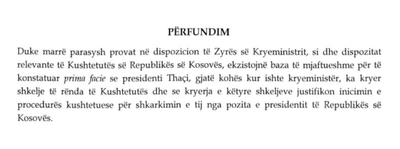 “Duke marrë parasysh provat në dispozicion te Zyrës së Kryeministrit, si dhe dispozitat relevante të Kushtetutës së Republikës së Kosovës, ekzistojnë baza të mjaftueshme për të konstatuar primn Jncie se presidenti Thaçi, gjatë kohës kur ishte kryeministër, ka kryer shkelje te rënda te Kushtetutës dhe se kryerja e këtyre shkeljeve justifikon inicimin e procedurës kushtetuese për shkarkimin e tij nga pozita e presidentit të Republikës së Kosovës”, thuhet në përfundimin e opinionit të Kurtit.
