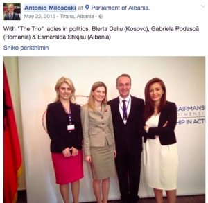 Në këtë foto është deputeti i VMRO-DPMNE, Antonio Milloshoski, i cili kohë më parë e ka postuar në facebook, lidhur me një takim të zhvilluar dy vite më parë me deputetet e Parlamentit të Shqipërisë dhe Kosovës, informon INA. Ai e ka postuar këtë foto si të veçantë, duke pasur edhe komente të ndryshme. Por Milloshoski sot është një nga deputetët më të zëshëm kundër deklaratës së partive shqiptare, përmes së cilës kërkohet avancimi i pozitës së shqiptarëve në Maqedoni./ina