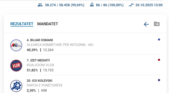 Sipas KSHZ-së, kandidati i VLEN-it, Izet Mexhiti, ka fituar 15.733 vota ose, 51,82%, ndërsa kandidati i koalicionit AKI, Bujar Osmani, ka fituar 12.264 vota, ose 40,39%.
