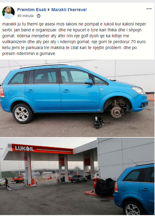 “Ju them që mos kaloni në pompat e Lukoil, kur kaloni nëpër Serbi. Janë bandë e organziuar dhe në këpucët e tyre kanë thika dhe i shpojnë gomat. Ndërsa menjëherë aty afër rrin një golf 2 që ka lidhje me automekanik dhe aty per aty i ndrrojn gomat, ku një gomë kushton 70 euro”, ka bërë të ditur mërgimtari.