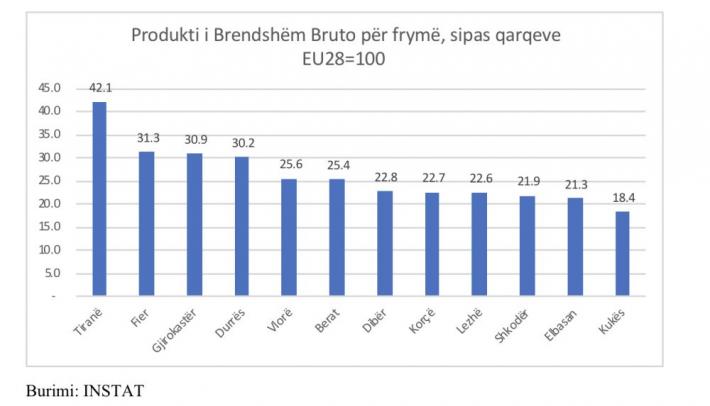 Të dhënat tregojnë se vetëm Qarku i Tiranës e ka PBB-në për frymë sa 42% e mesatares së BE-së, ndërsa 8 qarqe të tjera i kanë të ardhurat për frymë më pak se 25% të nivelit mesatar të BE-së për vitin 2017.