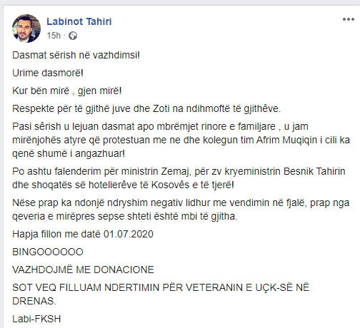 Këngëtari dhe ish-deputeti, Labinot Tahiri, përmes një statusi në rrjetin social e ka quajtur “Bingo” shfuqizimin e këtij vendimi, teksa thotë se një vendim i tillë i ka hapur edhe më shumë dyer rreth organizimit të aktiviteteve tjera humanitare.