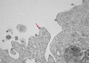 Kanë qenë Antonella Tosoni dhe Beatrice Marchini, ata që bënë vëzhgimet nën mikroskopin elektronik dhe prodhuan imazhet që tregojnë virusin vdekjeprurës. Në të parën, me një zmadhim prej 30000X, vërehen grimcat virale të SarsCov2 (të treguar nga shigjeta), të bashkangjitura në membranat në sipërfaqe dhe qelizat e brendshme, të përdorura për izolim.
