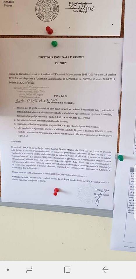 “Shkolla për të gjithë nxënësit që kanë parashtruar ankesë =kundërshtim ndaj vlerësimit të mësimdhënësit duhet të zhvillojë procedurën e vlerësimit nga komisioni vlerësues i shkollës”, thuhet në vendimin e DKA-së në Prizren,